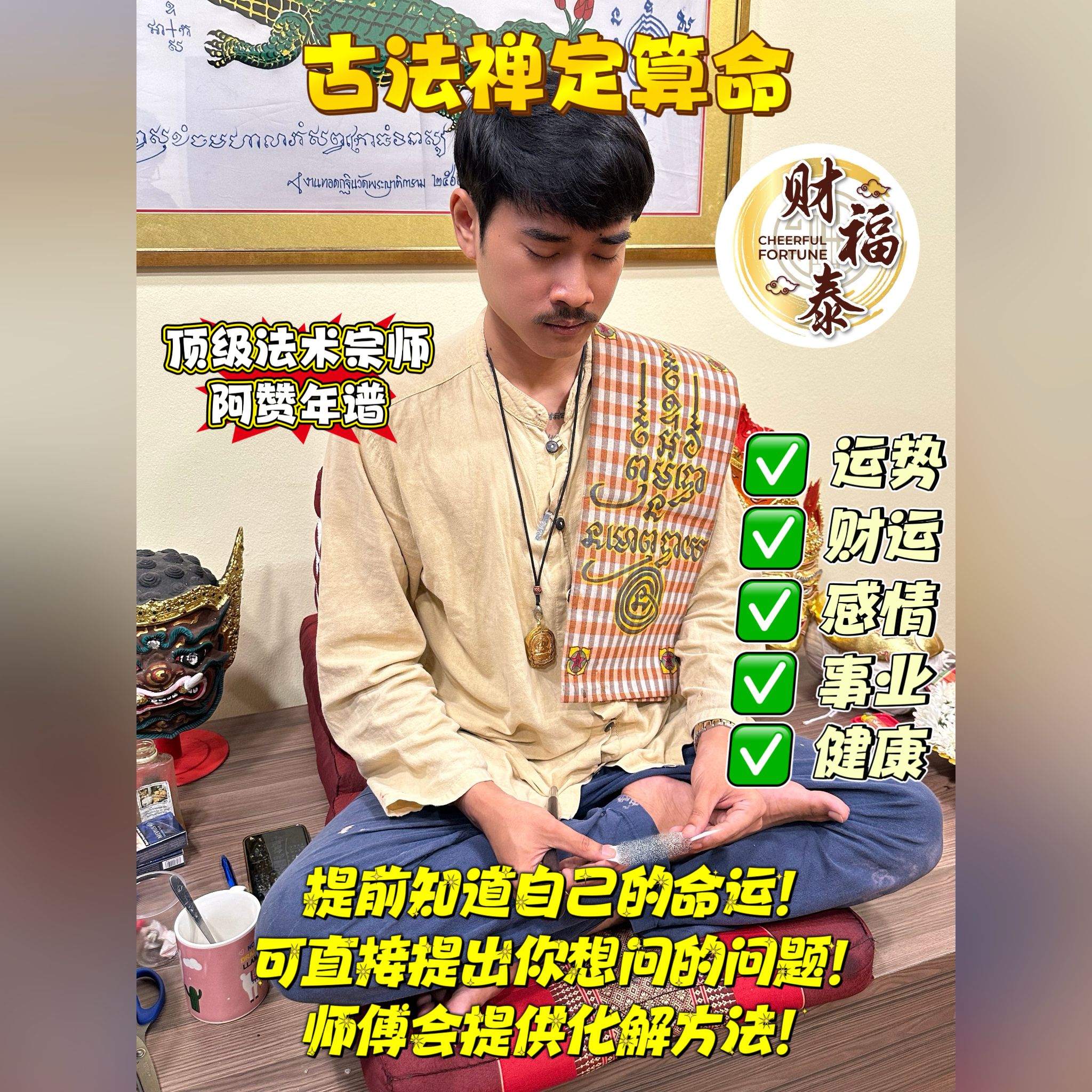 🔎 阿赞年谱依照传统修行法门,通过禅定入静观的方式,为善信查看当前整体运势变化。不同于普通占卜,此法重在观察个人气场、业力与现实因缘的流动,因此能更准确地看出问题的根源所在。